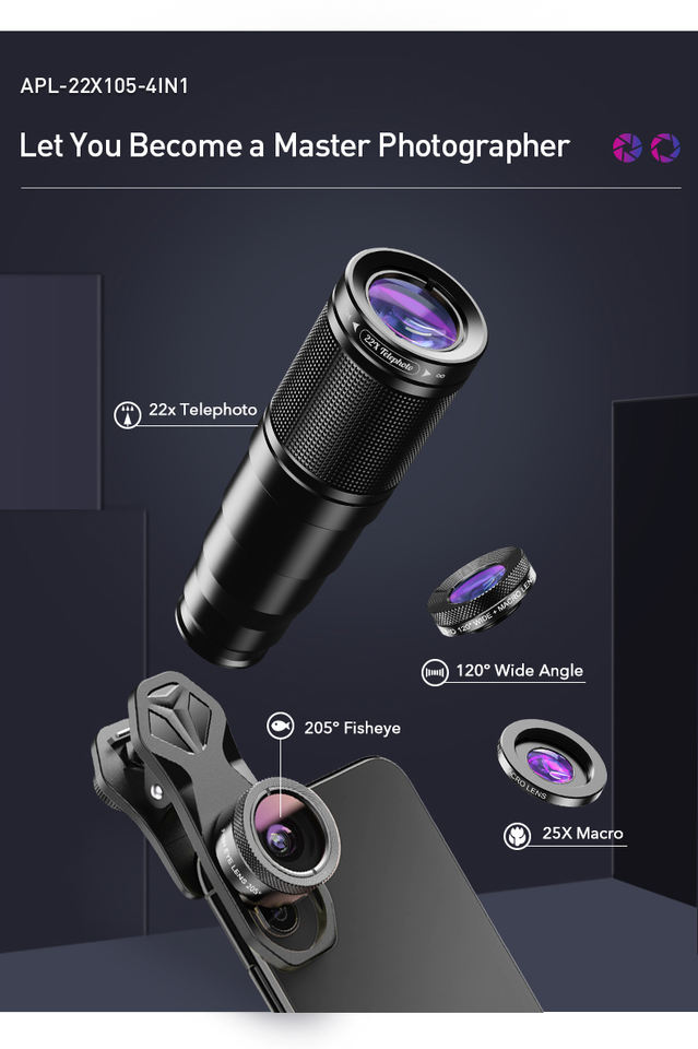Type de lentille:22x téléobjectif + macro + grand angle + objectif fisheye