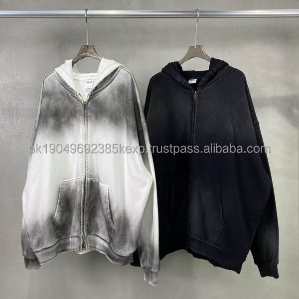 AR2668 Wholesale Heavy Weight Blank French Terry Custom DTG Print Street Zip Up Vintage Distressed Acid Washed Hoodie