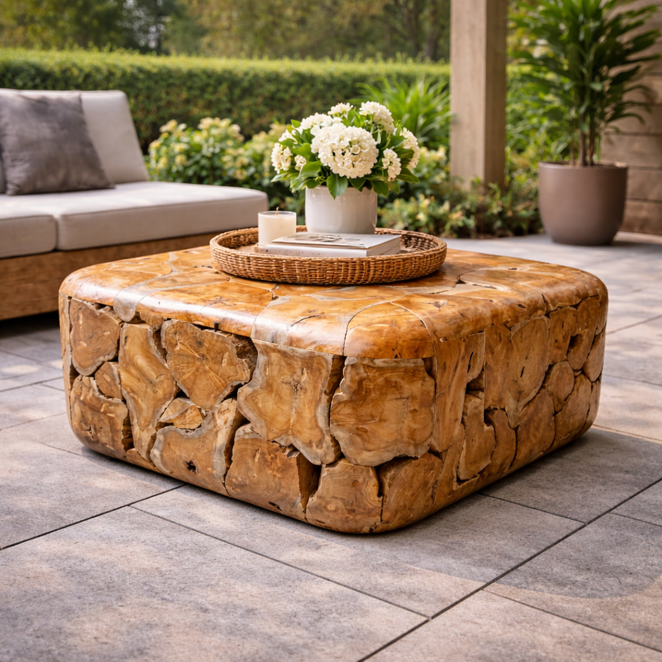Table cubique rustique en racine de teck, mobilier en bois fait main