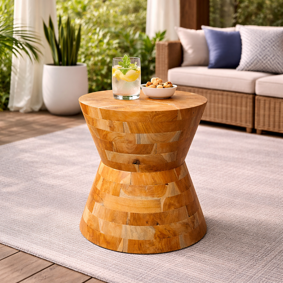 Table d'appoint sablier en teck, meuble rustique en bois fait main