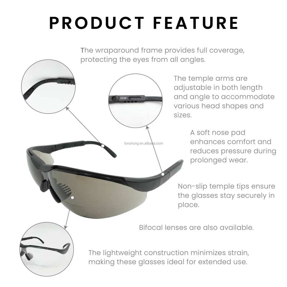 Angle- and length-adjustable temples; Bifocal lens option available