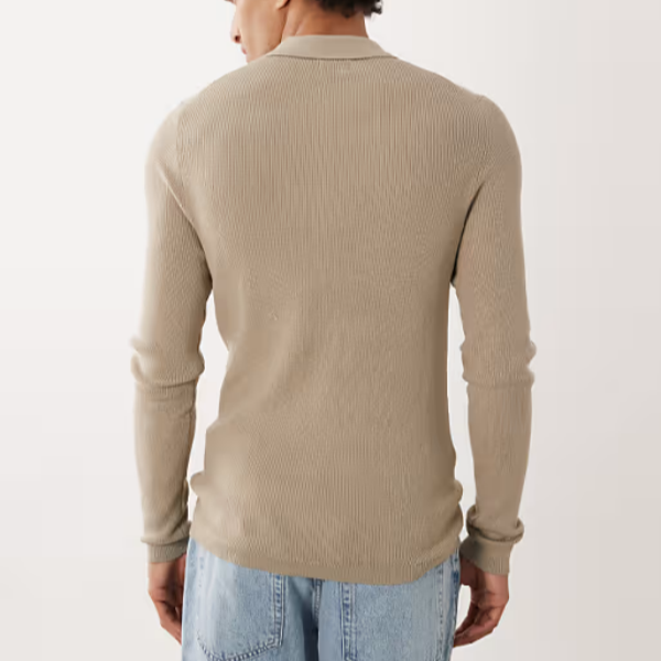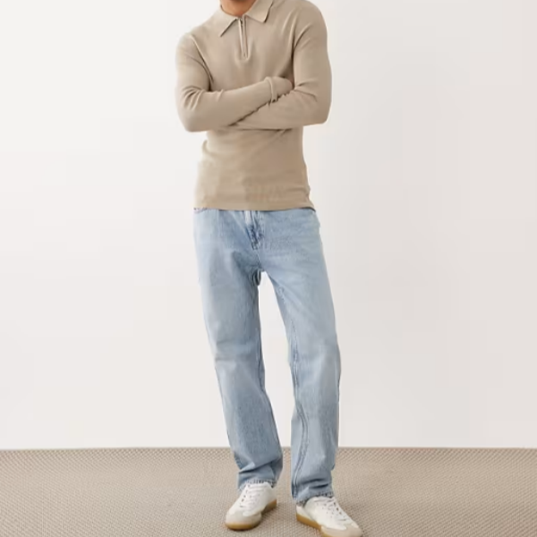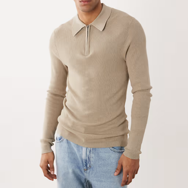 ASOS DESIGN Pull tricoté à manches longues pour homme, coupe ajustée, demi-zip, anti-rétrécissement, logo frontal, couleur pierre