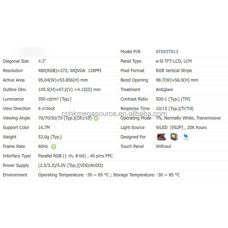 AT043TN13 Innolux LCD Module à cristaux liquides Panneau lcd 4.3 pouces 480*272 Modules lcd RVB