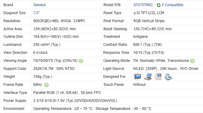 Interface:RGB parallèle (1 canal, 6/8 bits), FPC 50 broches