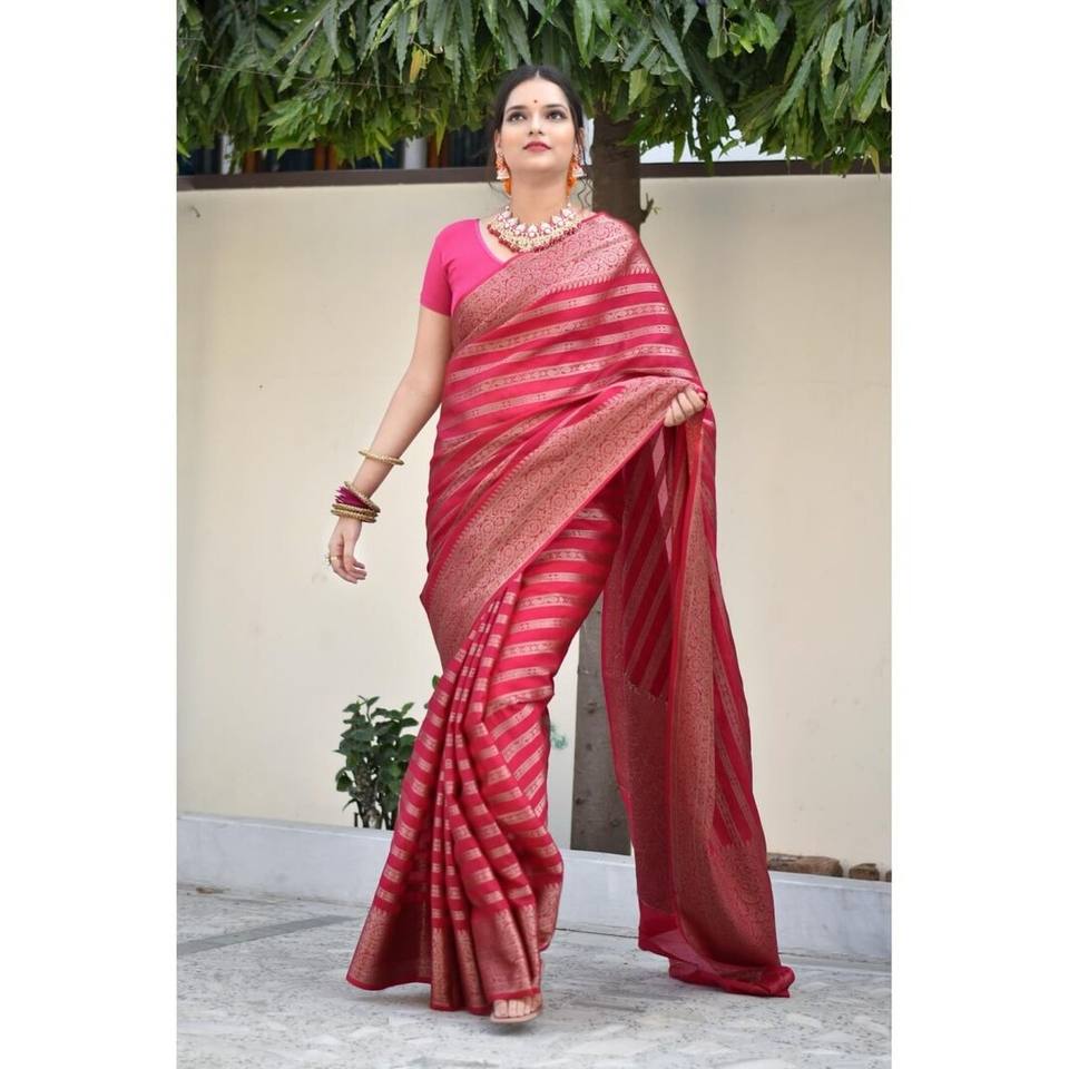 Sari en soie Banarasi attrayant avec travail en zari doré et blouse non cousue Rani