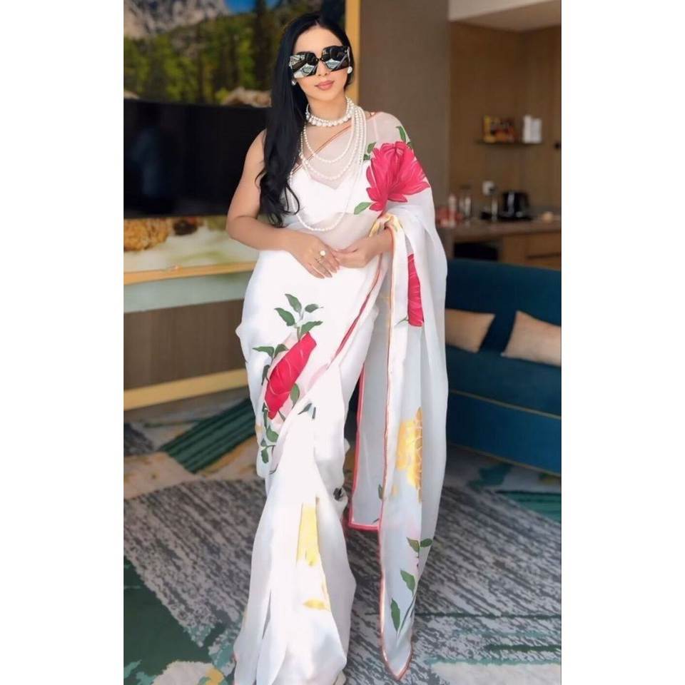 Sari prêt-à-porter en géorgette attrayante, multicolore, à imprimé floral numérique blanc, avec blouse non cousue