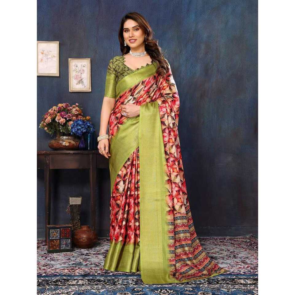 ATTRACTIVE BANARASI SOIE IMPRESSION NUMÉRIQUE ET JACQUARD TRAVAIL SAREE AVEC BLOUSE INCOSUE PERROQUET VERT