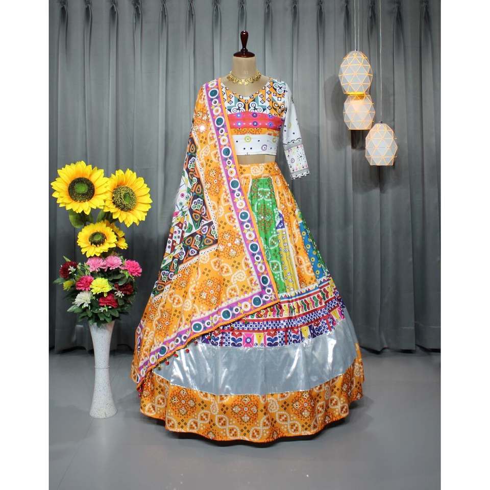 ATTRACTIF BEURRE SOIE IMPRIMÉ NUMÉRIQUE VÉRITABLE MIROIR TRAVAIL LEHENGA CHOLI AVEC DUPATTA JAUNE