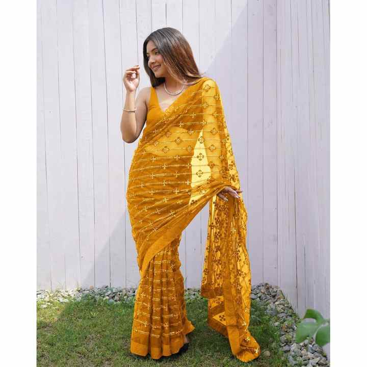 Sari attrayant avec broderie papillon, sequins et travail de diamants, avec blouse non cousue, jaune