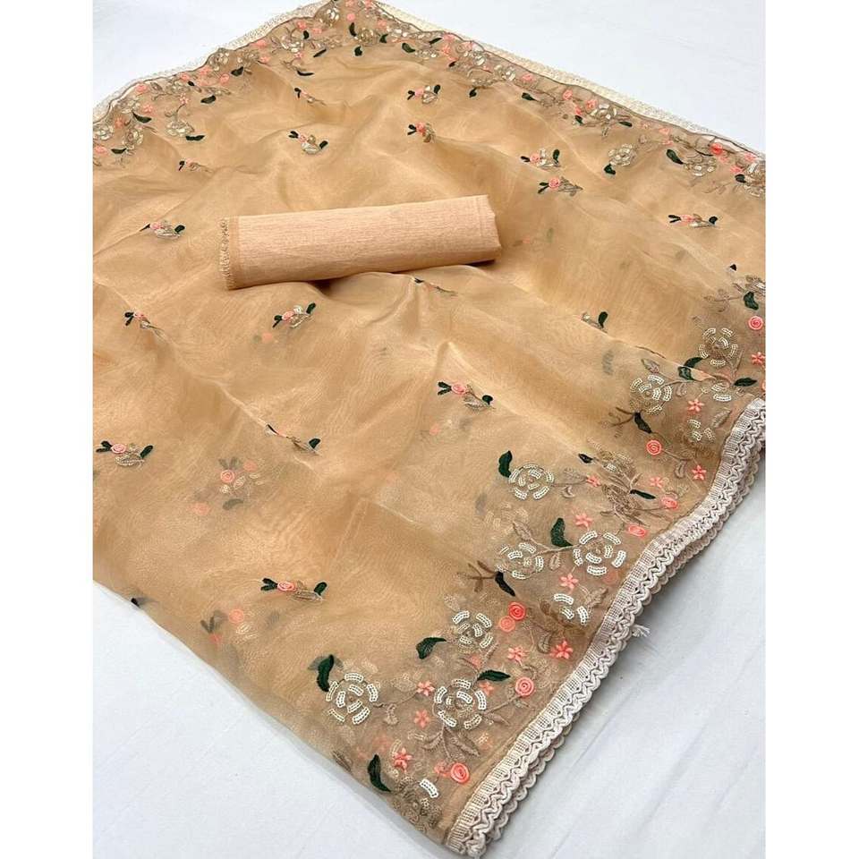 SÉQUENCE ORGANZA ATTRACTIVE ET CODAGE DE BRODERIE TRAVAIL SAREE AVEC BLOUSE NON COUSTÉE PÊCHE