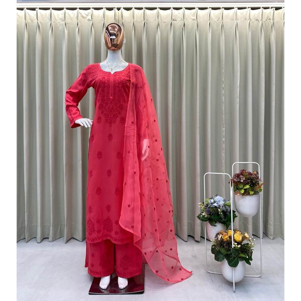 HAUT DE TRAVAIL DE BRODERIE AU FIL DE RAYONNE ATTRACTIF PALAZZO AVEC DUPATTA ROUGE