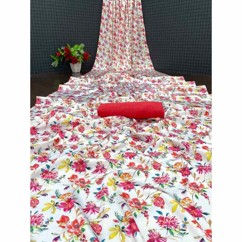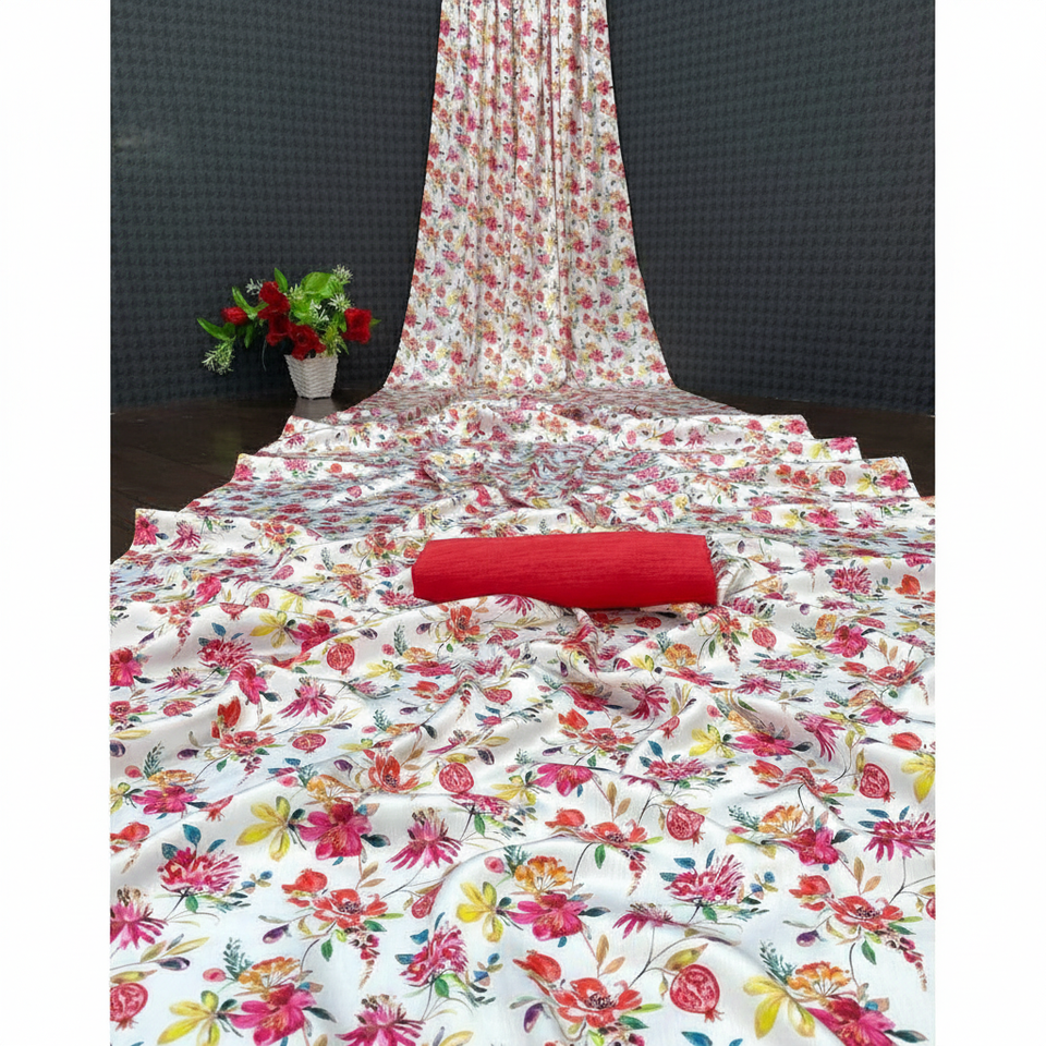 SAREE IMPRIMÉ NUMÉRIQUE FLEUR EN SOIE DOUCE ATTRACTIVE AVEC BLOUSE NON COUCHÉE ROUGE