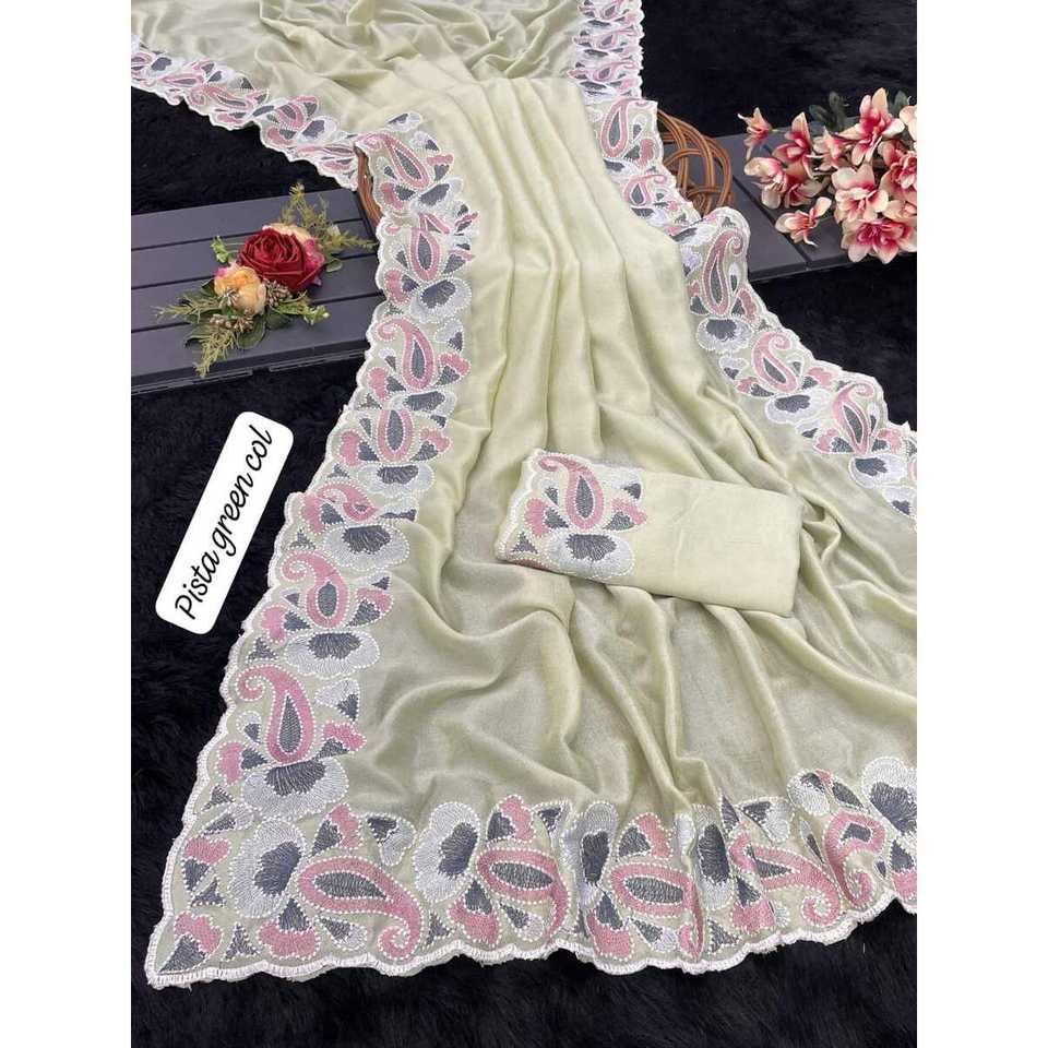 ATTRACTIVE VICHITRA SOIE MULTI-FILS BRODERIE AVEC COUPE TRAVAIL SAREE AVEC CHEMISIER NON COUDU PISTA