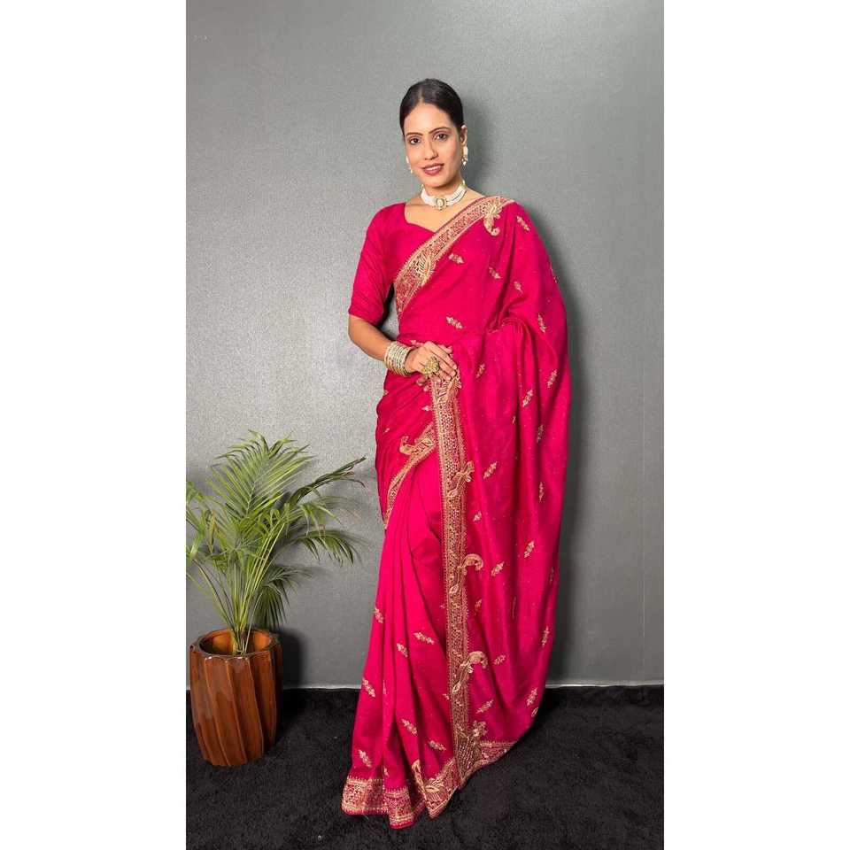 ATTRACTIVE VICHITRA SOIE ZARI AVEC DMC SWAROVSKI TRAVAIL 1 MINUTE SAREE AVEC CHEMISIER NON COUDU RANI
