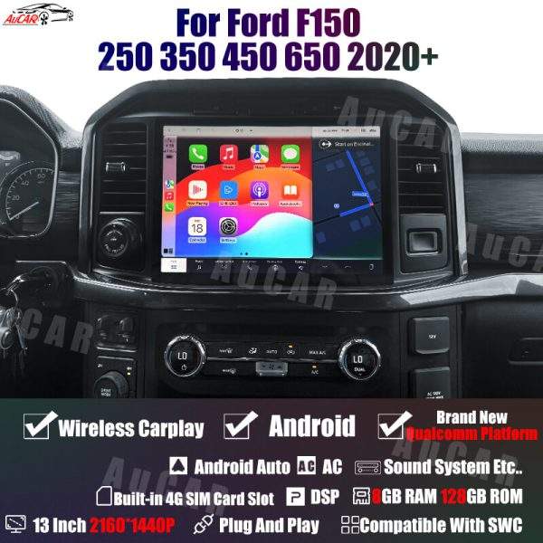 Lecteur DVD vidéo de voiture AUCAR 13 pouces Android 13 avec navigation GPS pour Ford F150 F250 F350 F450 F650 Raptor 2020+ Écran tactile autoradio