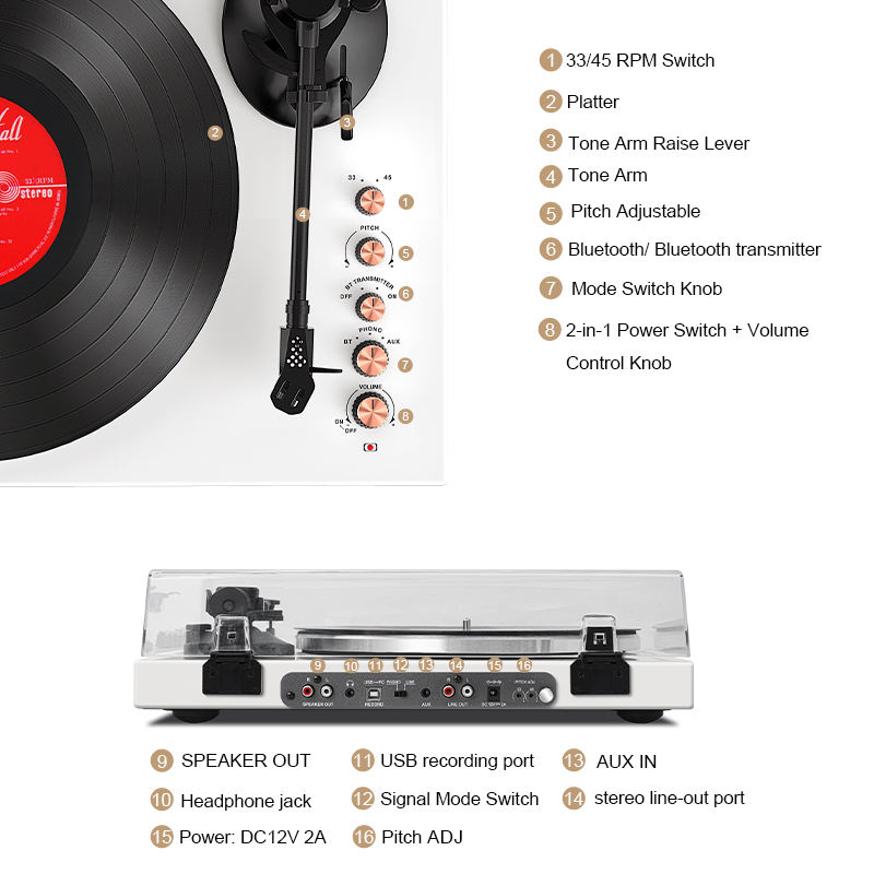 AUDMIC Platine DLB-003 Tourne-disque Vintage Audio Technica Vinyle Bluetooth Cartouche Électrique Phono Préampli Enregistrement Externe