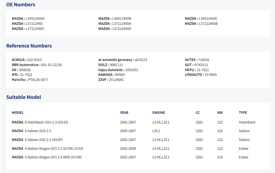 | MAZDA | 6 Saloon | 2002.06-2007.08 | 2.3 (122KW,166PS) |