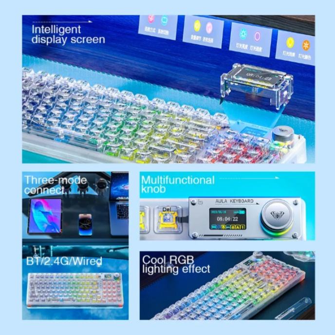 AULA F98pro clavier mécanique personnalisé Transparent 3 modes 2.4G BT sans fil Mini écran affichage rvb échangeable à chaud Gateron nouveau