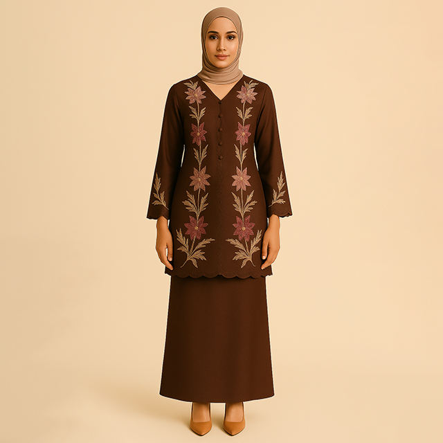 AURA Plus Size Modeste Traditionnel Musulman Ensemble de Vêtements Baju Kurung Broderie Fluide Polyester Tissus Antistatique Accessoire