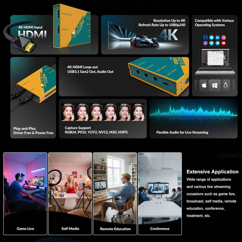 Carte de capture vidéo AVMATRIX 4K USB3.0 avec sortie en boucle pour jeux, diffusion en direct, utilisation avec caméra - Compatible Xbox/PS4/Wii/Nintendo Switch