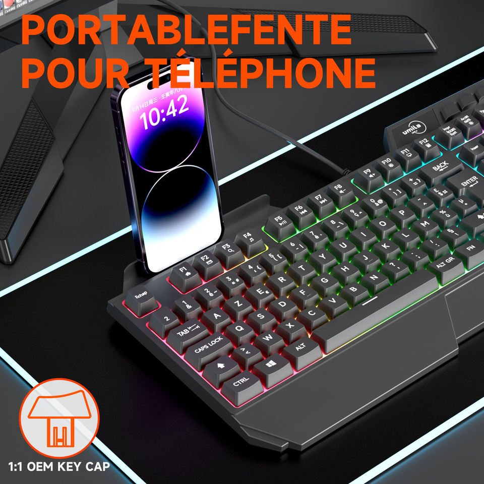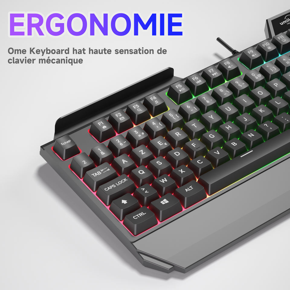 Clavier Gaming Français AZERTY Rétroéclairé Arc-en-ciel Filaire Sensation Mécanique Étanche pour Ordinateur