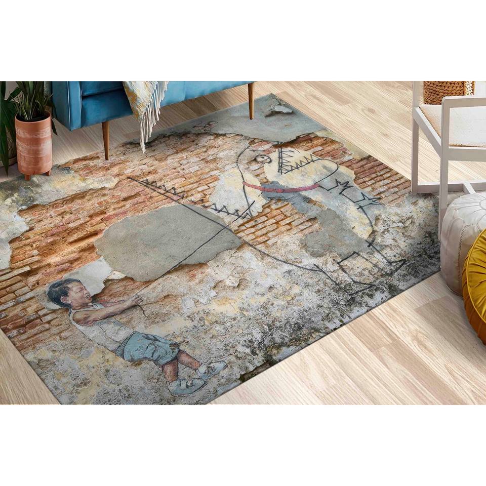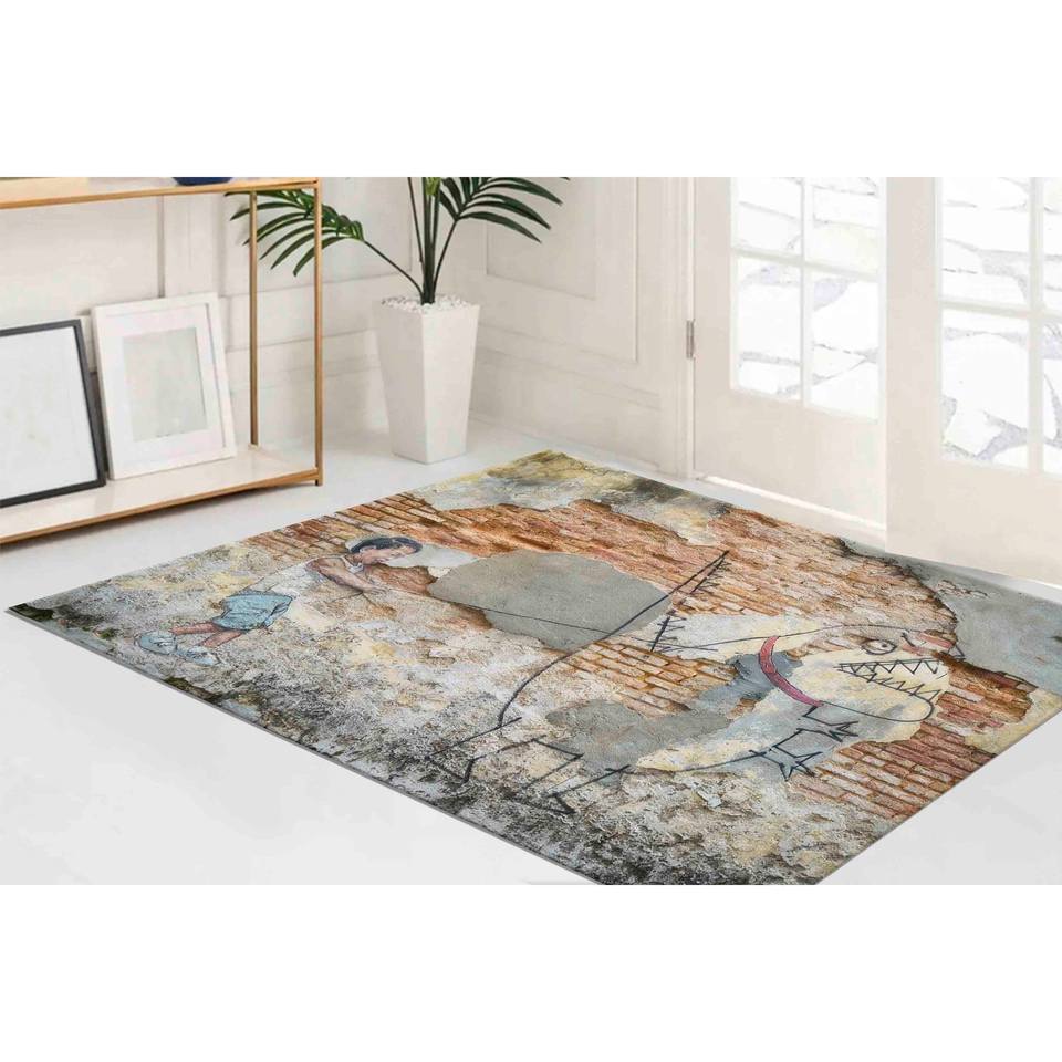 Tapis abstrait Dino Street Graffiti : Tapis imprimé avec un design moderne de dinosaures, tapis à poils doux