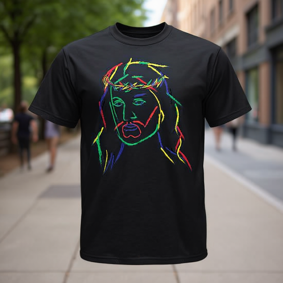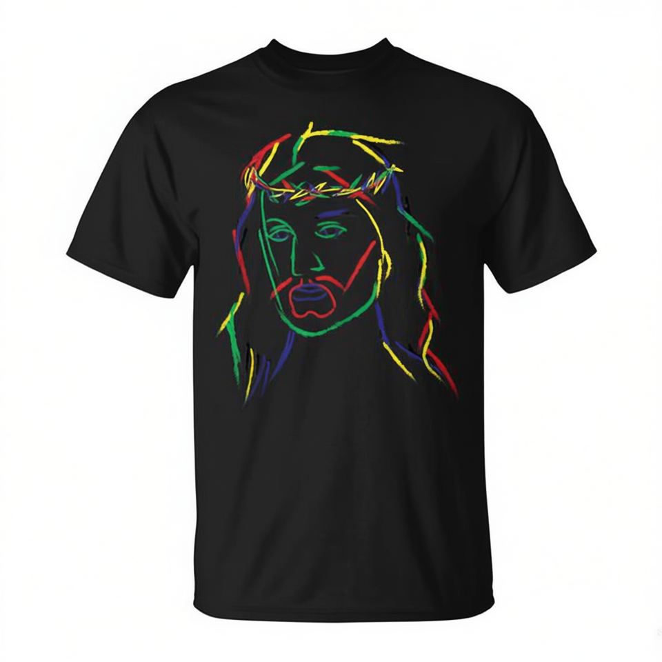 T-shirt à manches courtes col rond imprimé numériquement avec un motif abstrait de Jésus, noir, unisexe, cadeau religieux