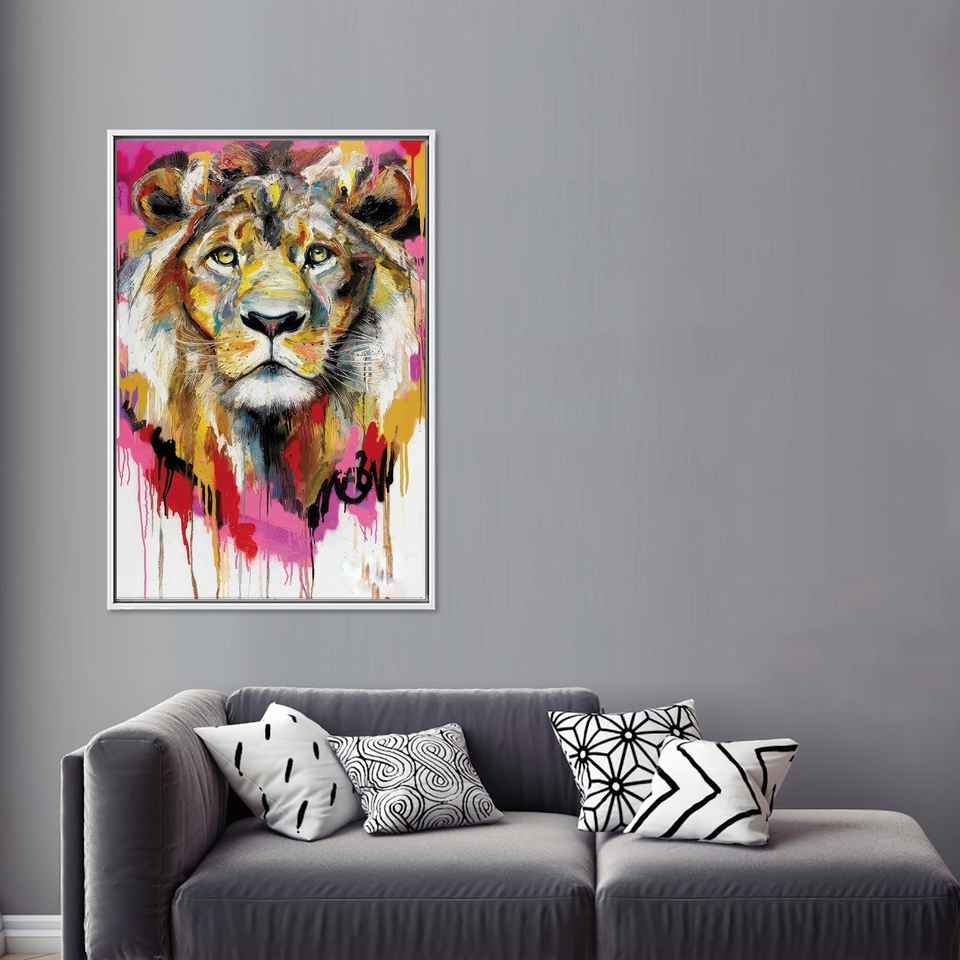Toile en verre trempé avec motif de lion abstrait : imprimé animal coloré, toile encadrée blanche