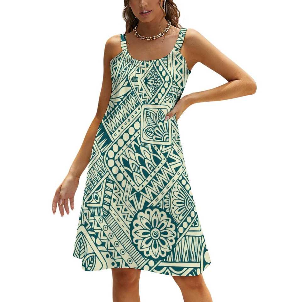 Robe d'été décontractée pour femme à bretelles spaghetti, imprimé lignes ondulées abstraites, design polynésien, color block vert et noir audacieux
