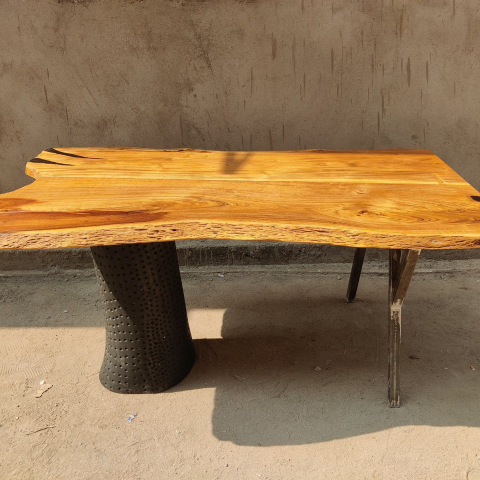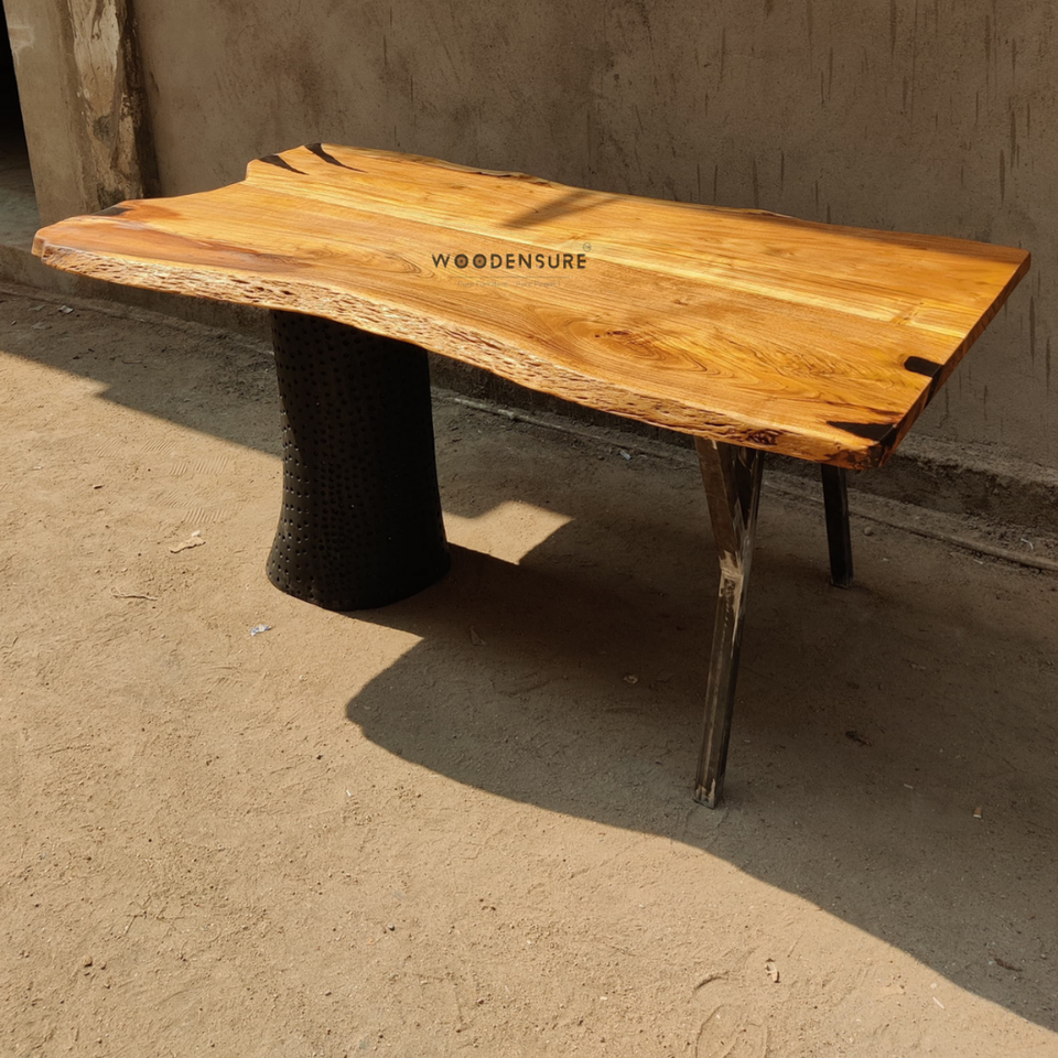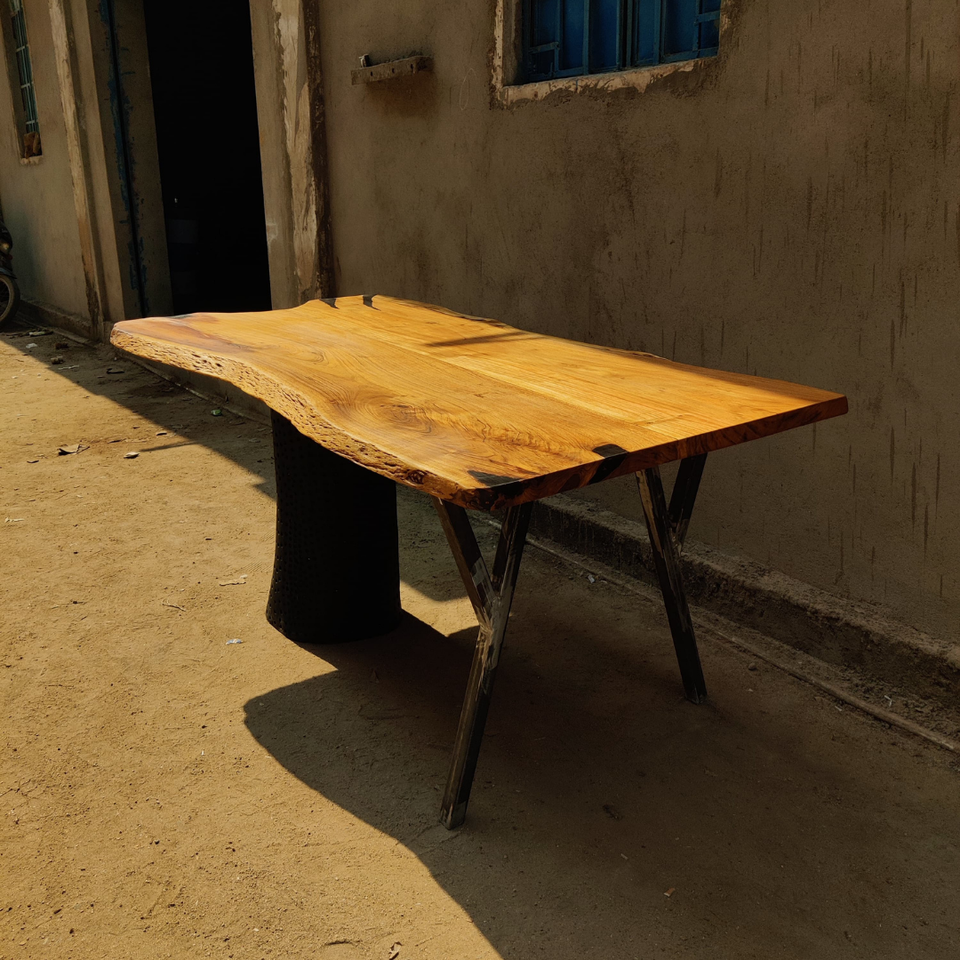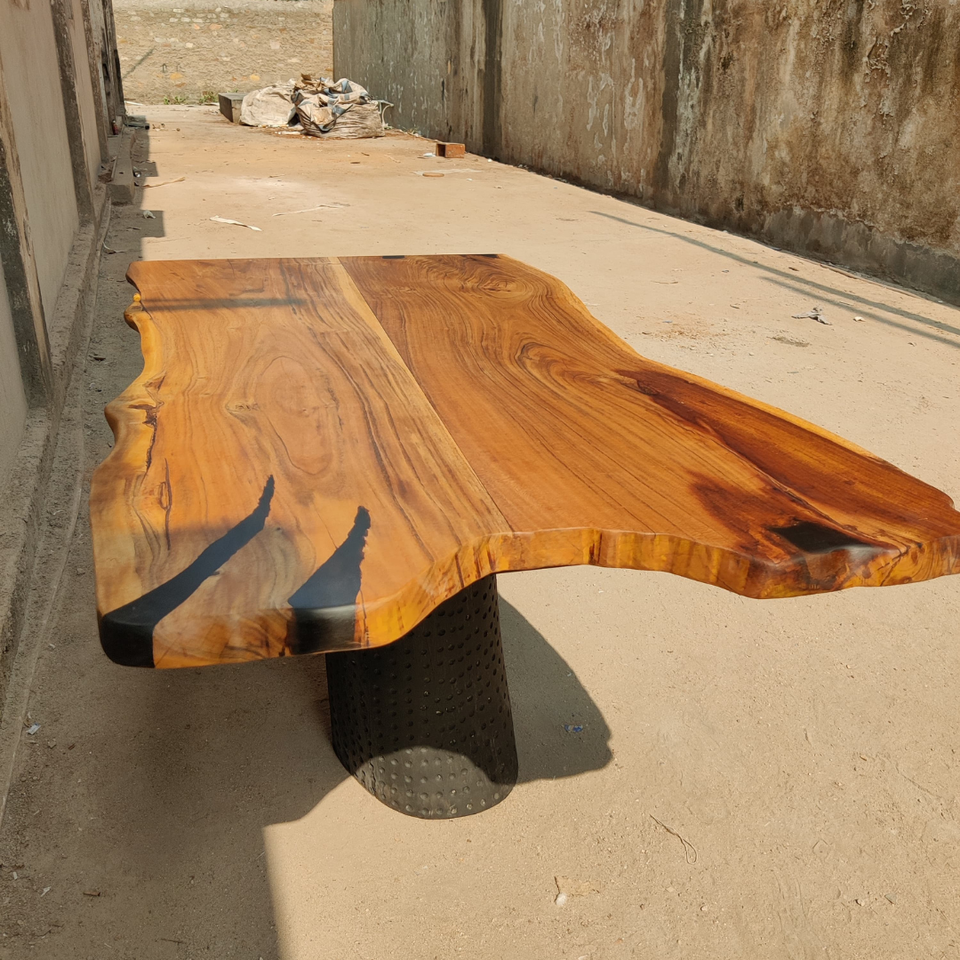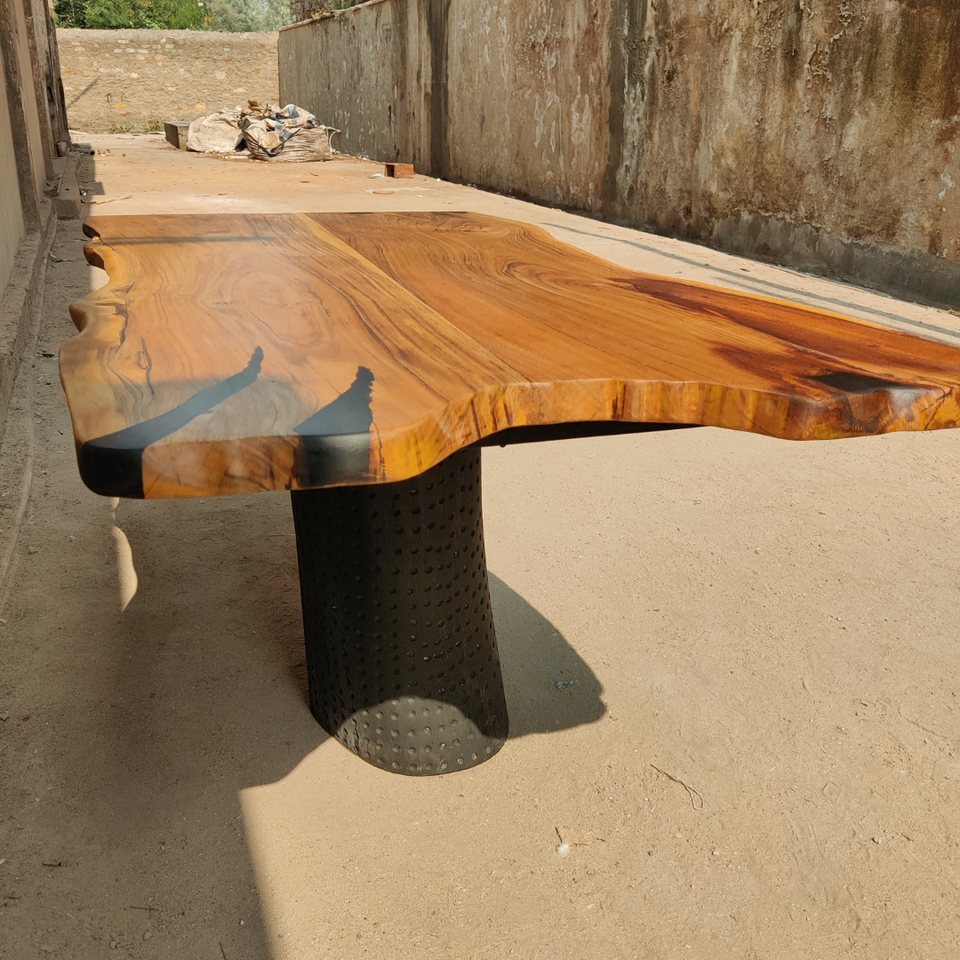 Table à manger en acacia à bord vivant avec base de coffre en bois Table à manger de ferme et moderne faite à la main en résine époxy minimale unique