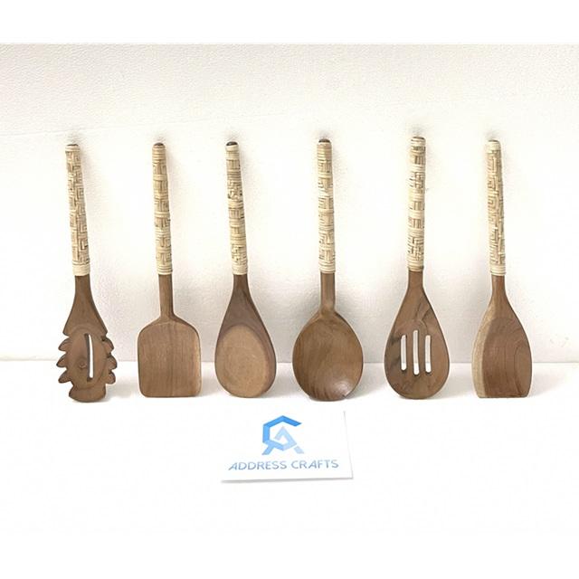Cuillère de service en acacia Spatules fendues Spatules frites Ensemble de cuillères à huile Ustensiles de cuisine avec manche en rotin Outils de cuisine