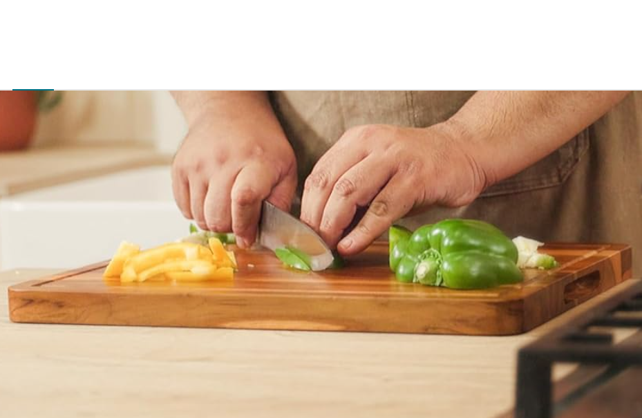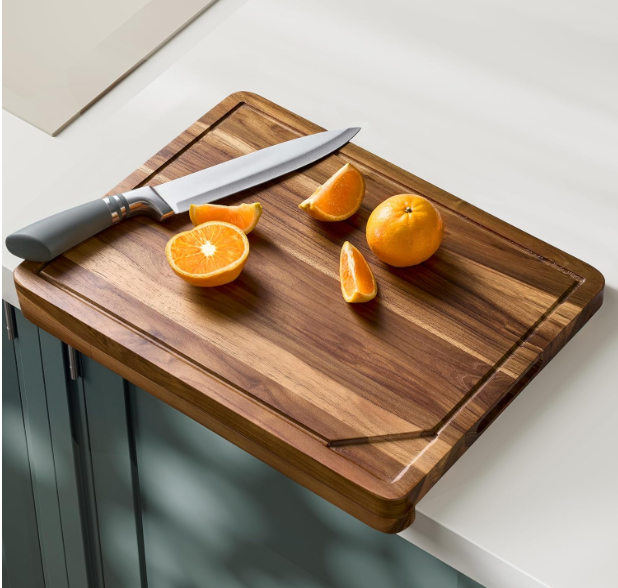 Planche à découper rectangulaire en bois d'acacia avec rainure profonde pour le jus, poignées latérales pour la découpe des fruits