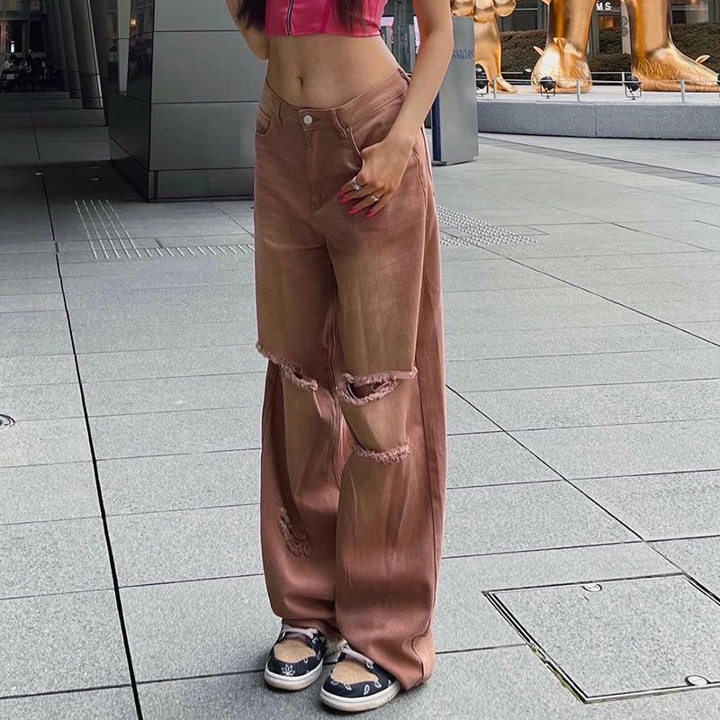 Jeans pour femmes de couleur graduée lavés à l'acide avec trous taille haute pantalon amincissant de couleur unie