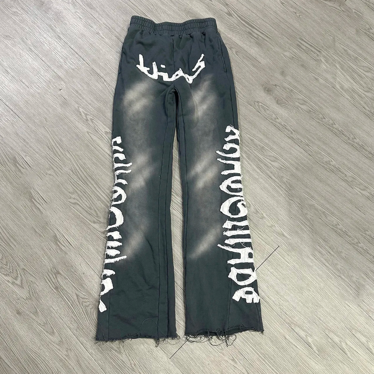 Survêtement vintage délavé à l'acide pour hommes, patch découpé et cousu, sweat à capuche et pantalon de survêtement évasé pour hommes