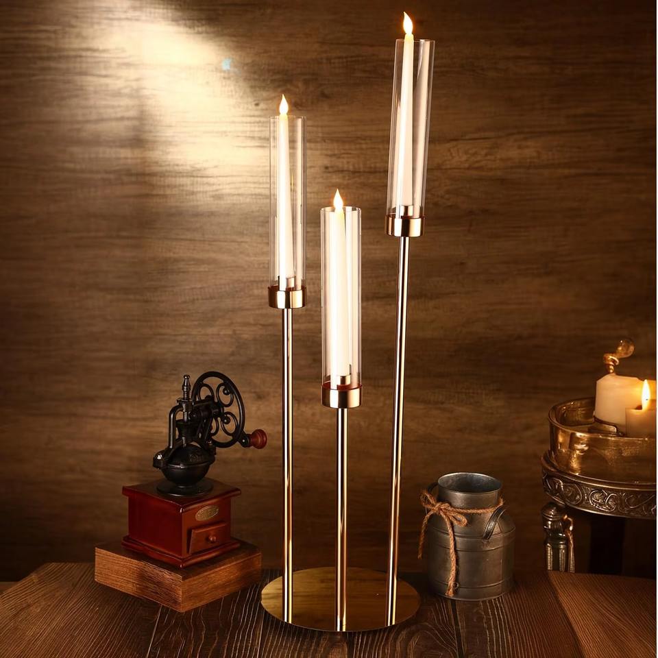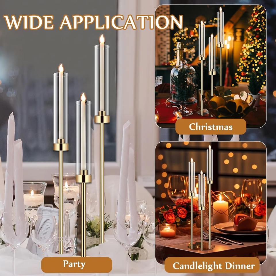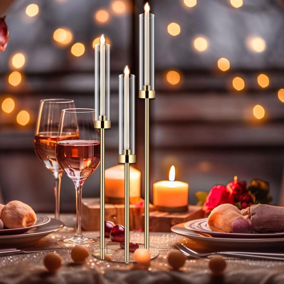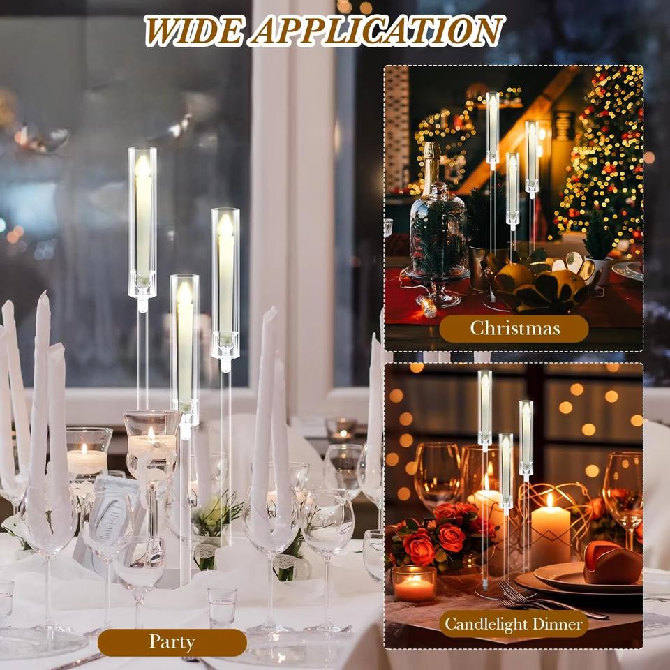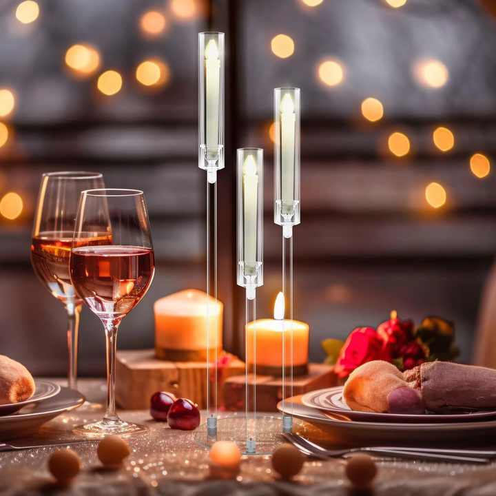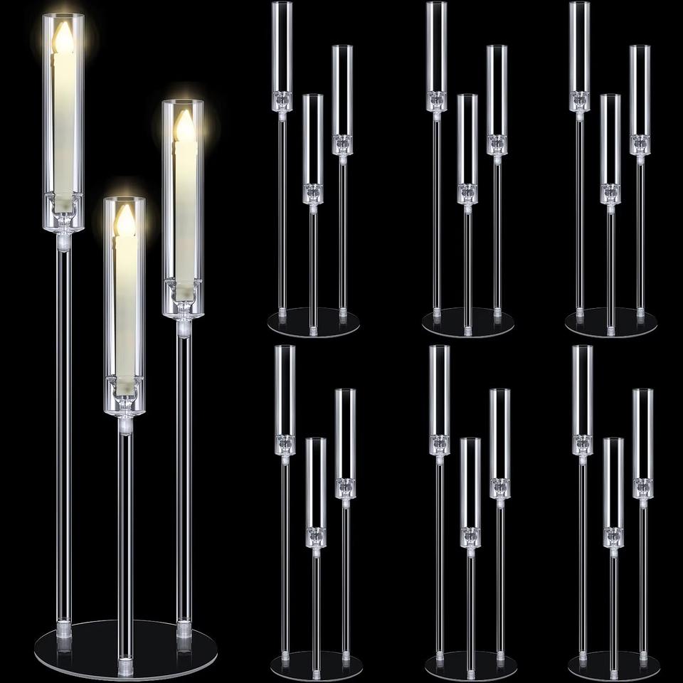 Chandelier moderne à 3 bras en acrylique pour bougies coniques, 78 cm, support de bougie LED transparent avec base circulaire, alimentation secteur, pour mariage et table de fête