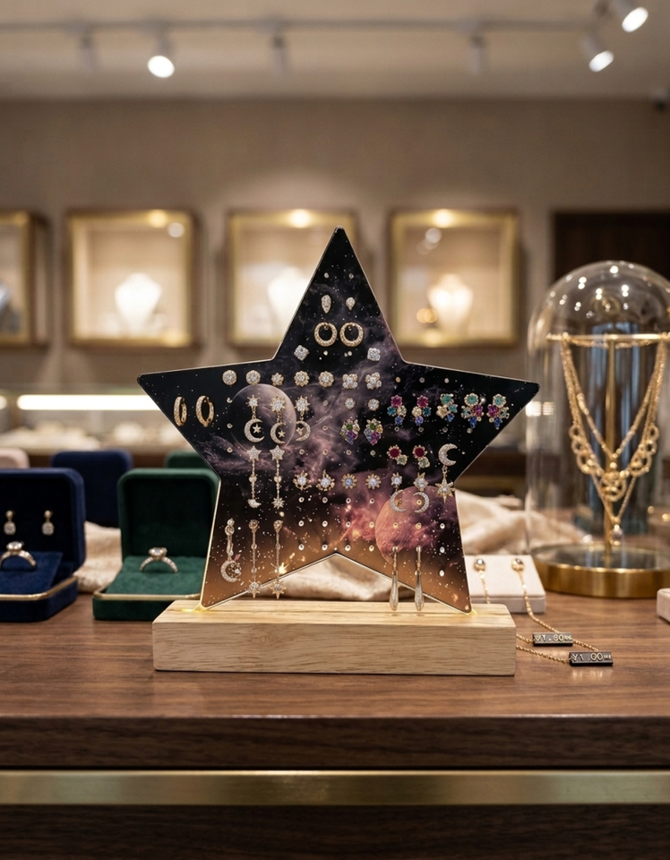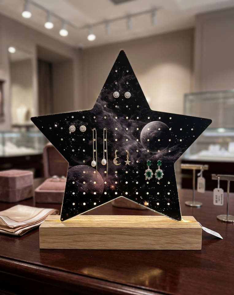 Support de présentation d'oreillettes en acrylique en forme d'étoile avec base en bois, organisateur de bijoux et présentoir