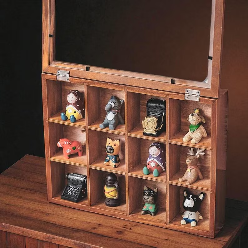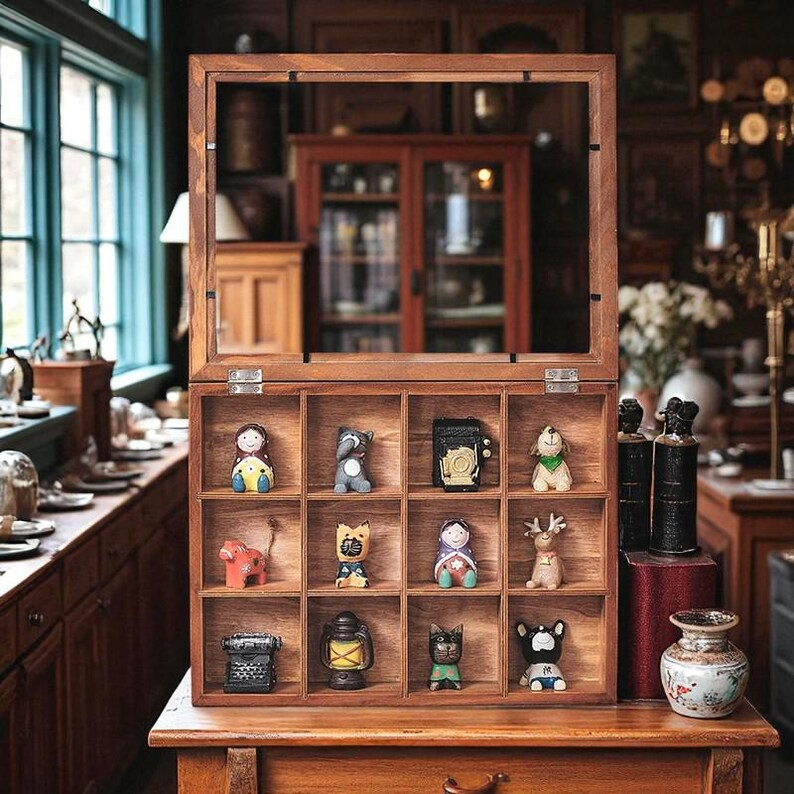 Boîte de présentation en acrylique et bois avec couvercle anti-poussière-12 compartiments pour organisateurs de bureau Poupées et bijoux de collection