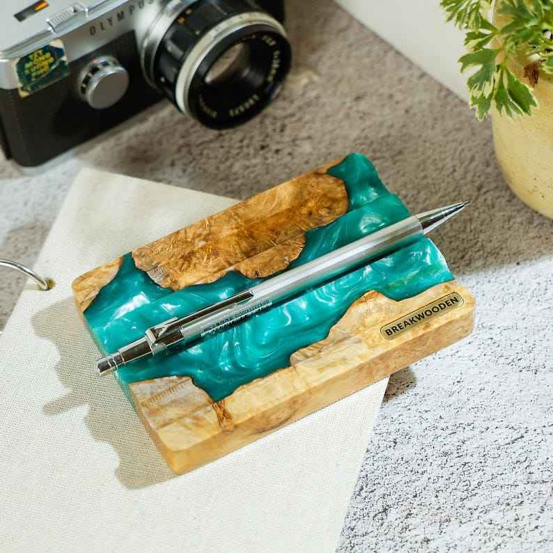 Ajoutez une touche d'art artisanal à votre espace de travail avec ce porte-stylo en résine et en bois.