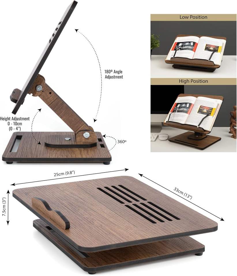 Ajustable à 360° ° Support de livre en bois pliable, support de livre réglable en hauteur, pince à pages, support pour partitions et recettes
