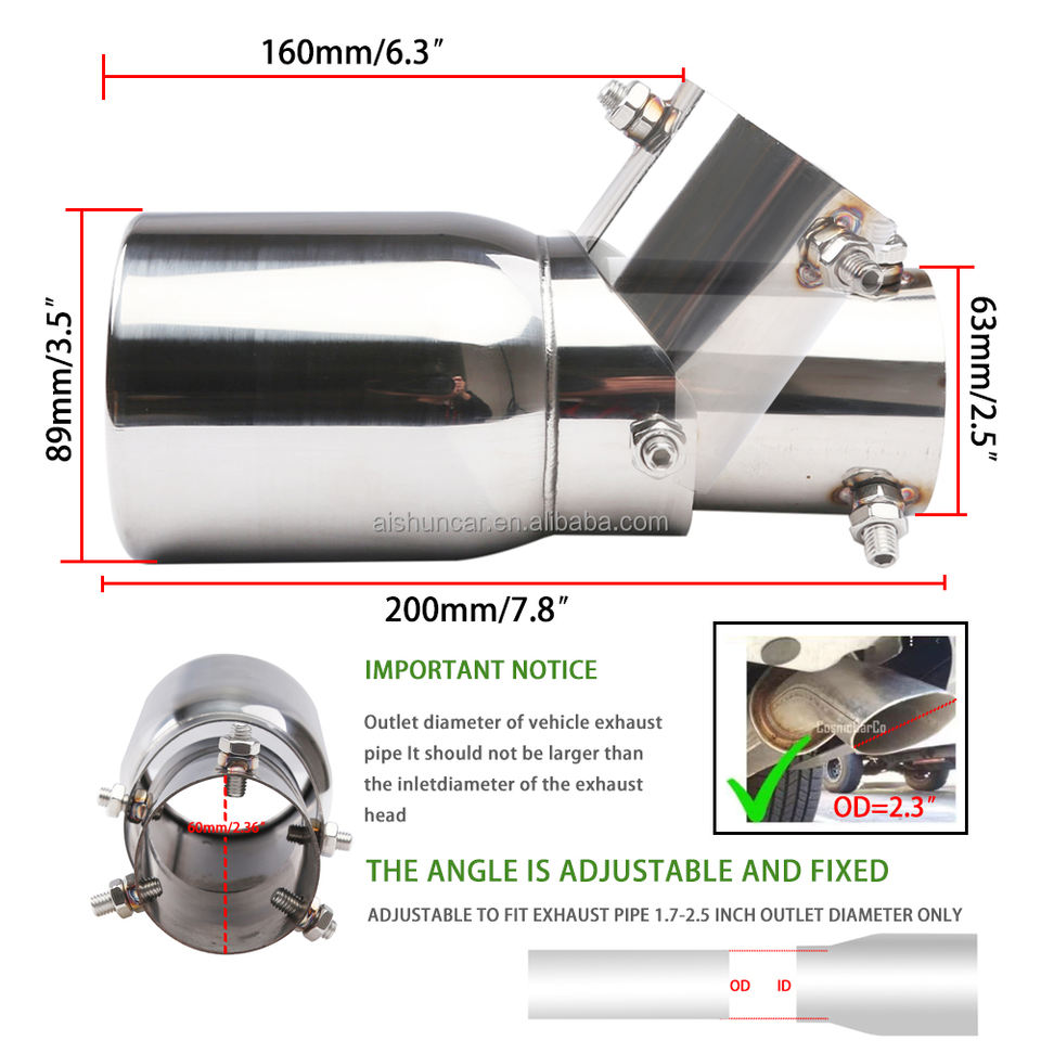 Embout d'échappement en acier inoxydable à angle réglable, entrée 2,5 pouces, sortie 3,5 pouces (160-200 mm), directement de l'usine OEM pour les tuyaux de voiture droits/courbés
