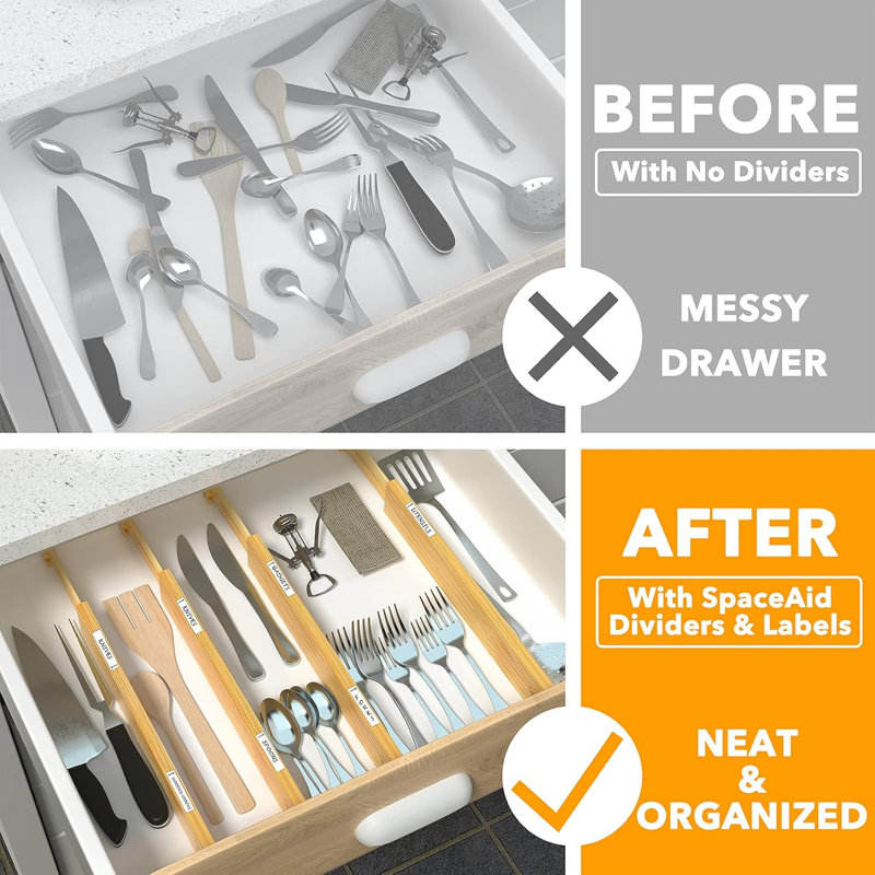 Organiseurs de tiroirs ajustables en bambou et plastique DreamCraft avec étiquettes pour la cuisine, le bureau, la salle de bain, le rangement des vêtements, l'utilisation dans la garde-robe