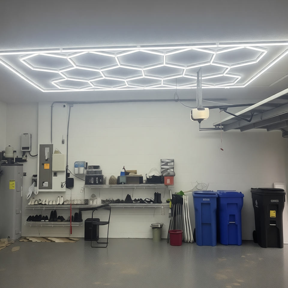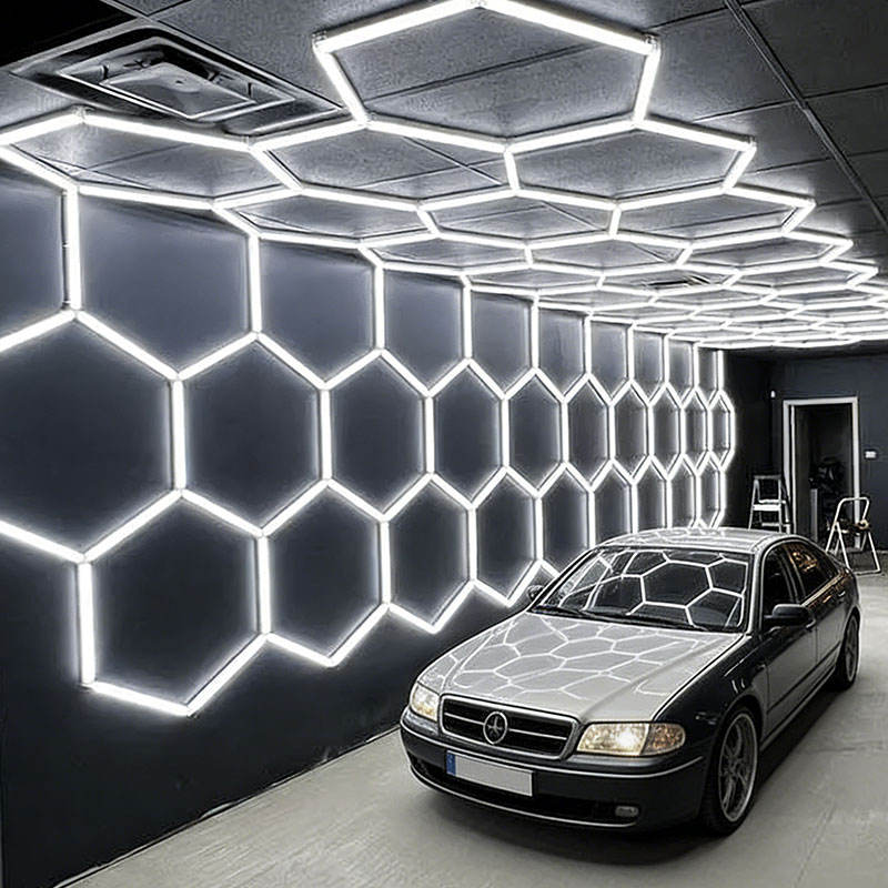 Lampe LED hexagonale pour garage, idéale pour le lavage de voiture.