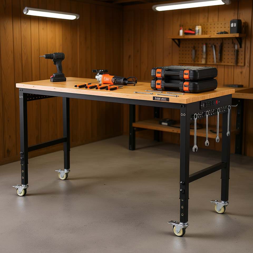 Plan de travail réglable en hauteur de 60 pouces sur roulettes avec prise électrique pour le travail du bois