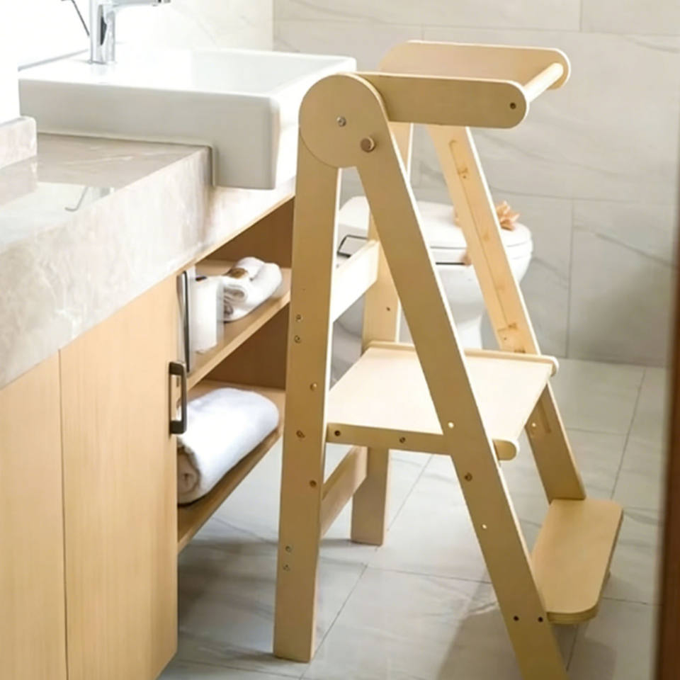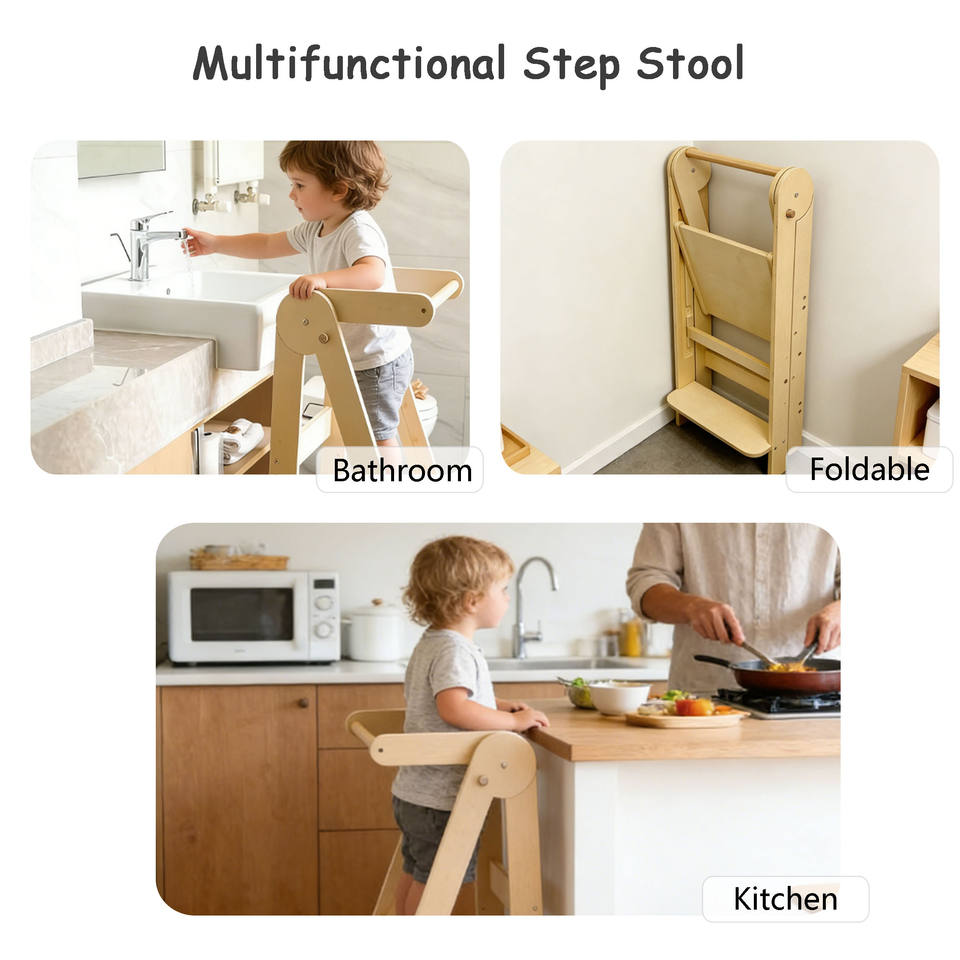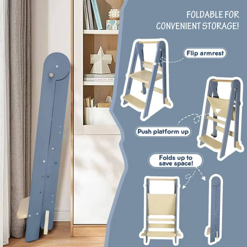Tour d'apprentissage moderne pliable à hauteur réglable, marchepied pour tout-petits en bois de haute qualité avec repose-pieds antidérapant, idéal pour l'école et l'appartement