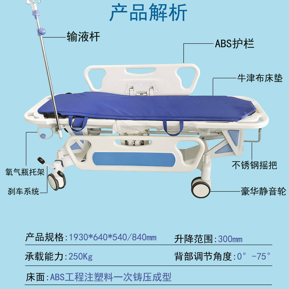 Adjustable Height Hospital Transfer Cart With 4 Castors For Emergency And Examination Use