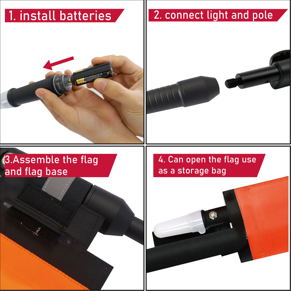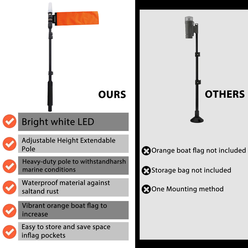 Composants inclus:Mât de drapeau réglable, bâti, lumières menées blanches de kayak, drapeau orange de sécurité