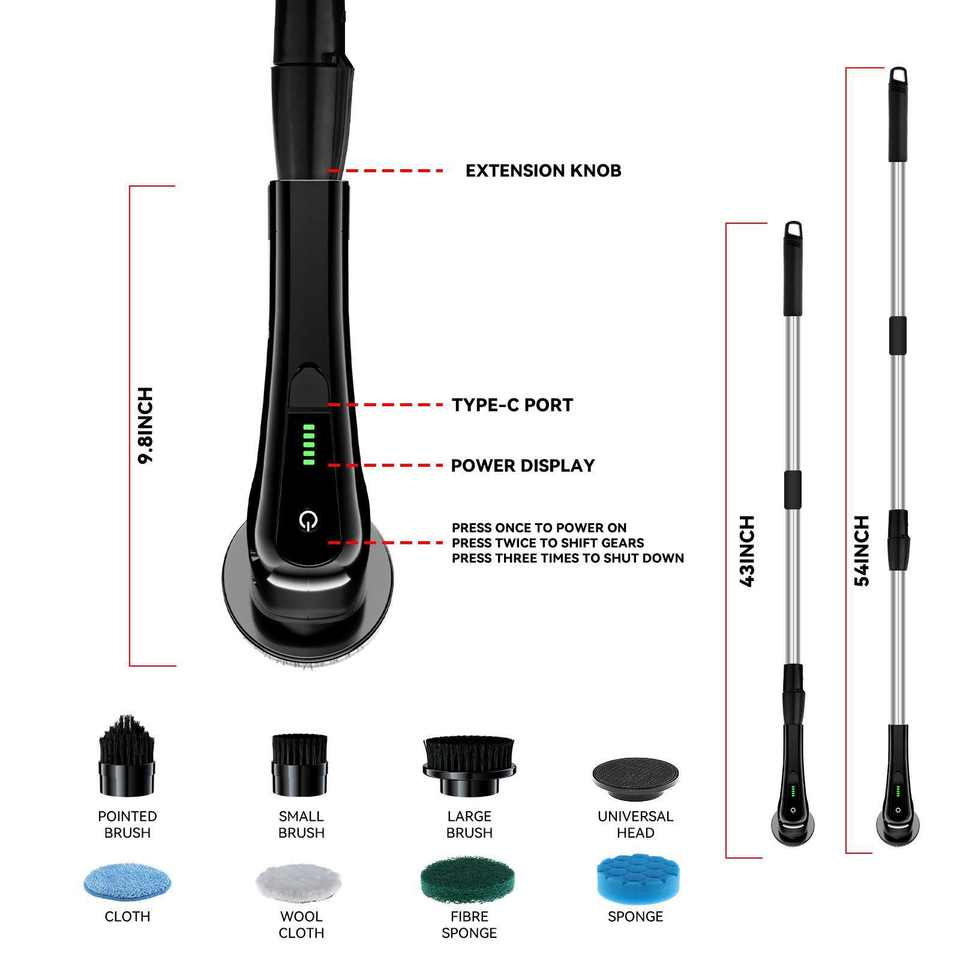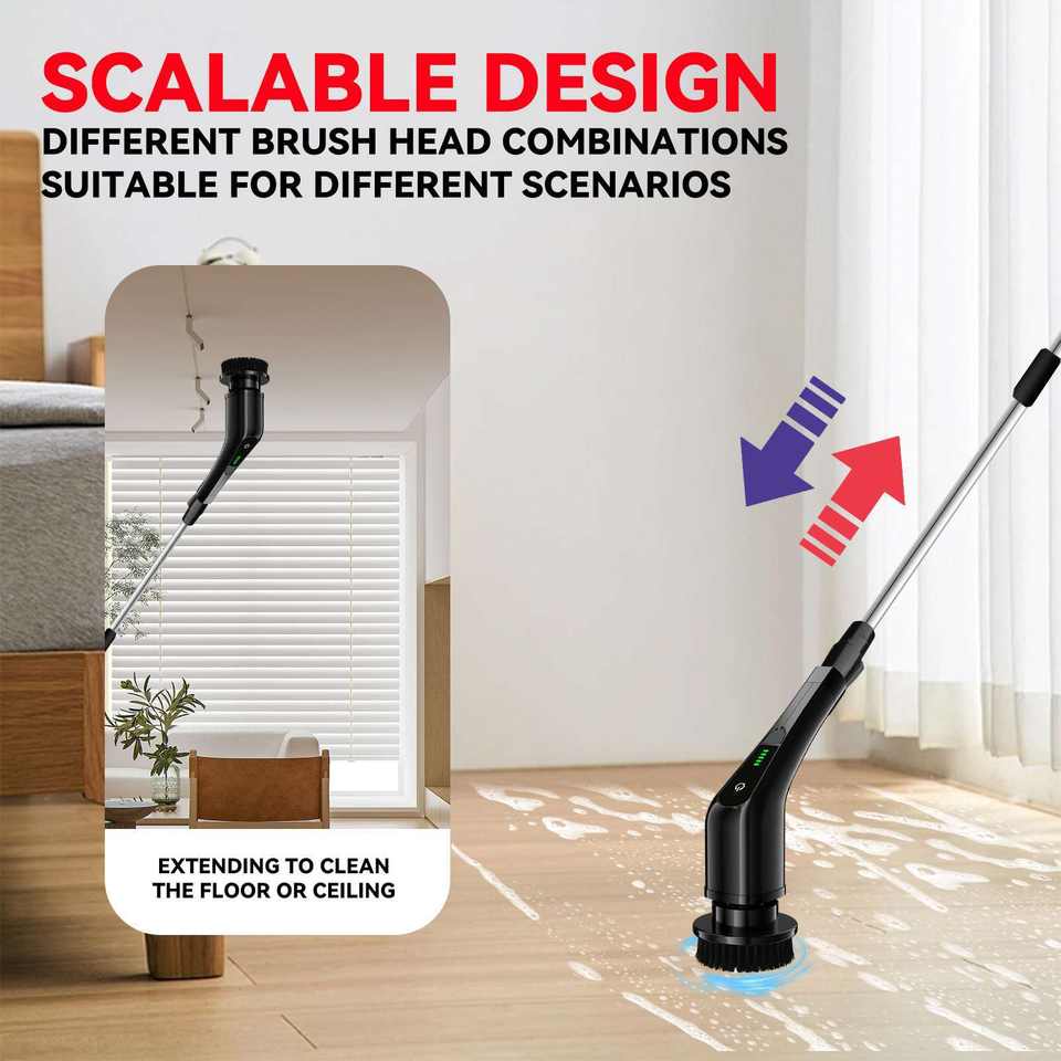 Long manche réglable et 7 têtes de brosse remplaçables, 2 brosses de nettoyage à vitesse rotative pour épurateur de douche électrique