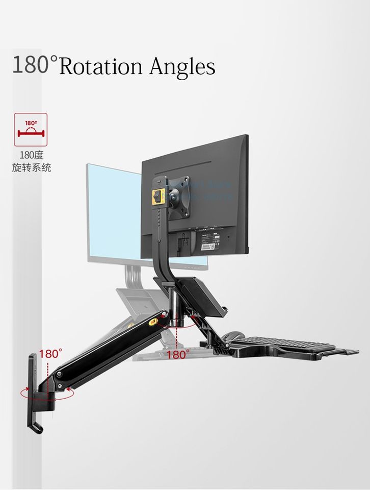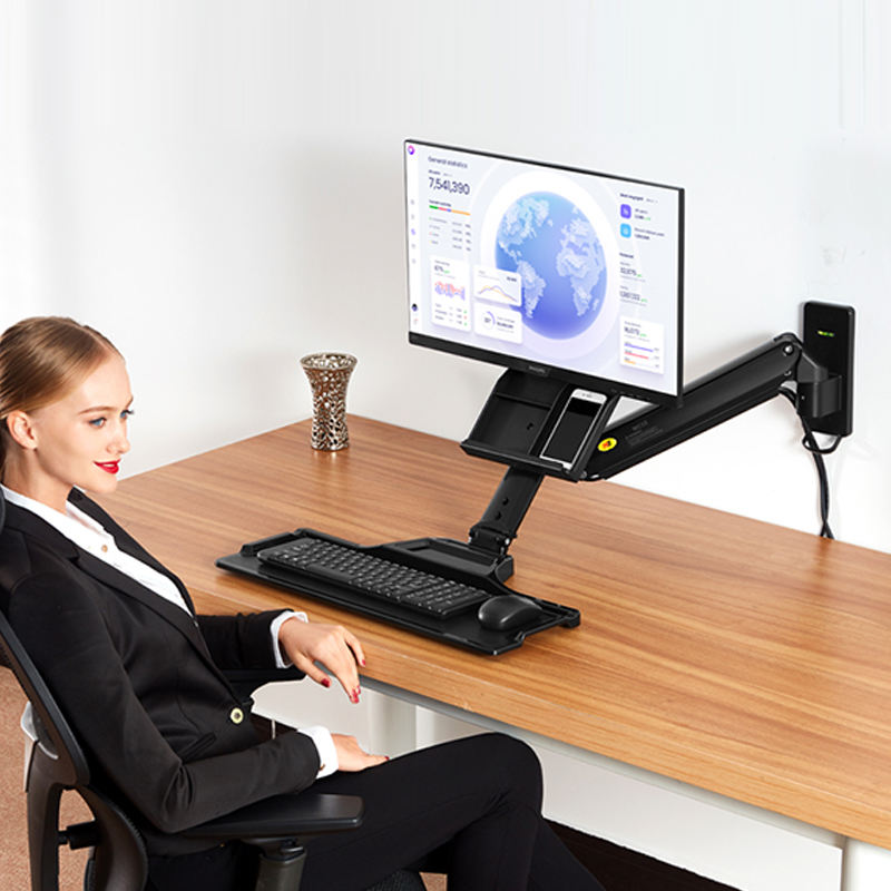 Station de travail murale réglable MB32, bras à ressort à gaz facile à utiliser, support d'écran de 19 à 27 pouces, plateau pour clavier en aluminium, assis-debout