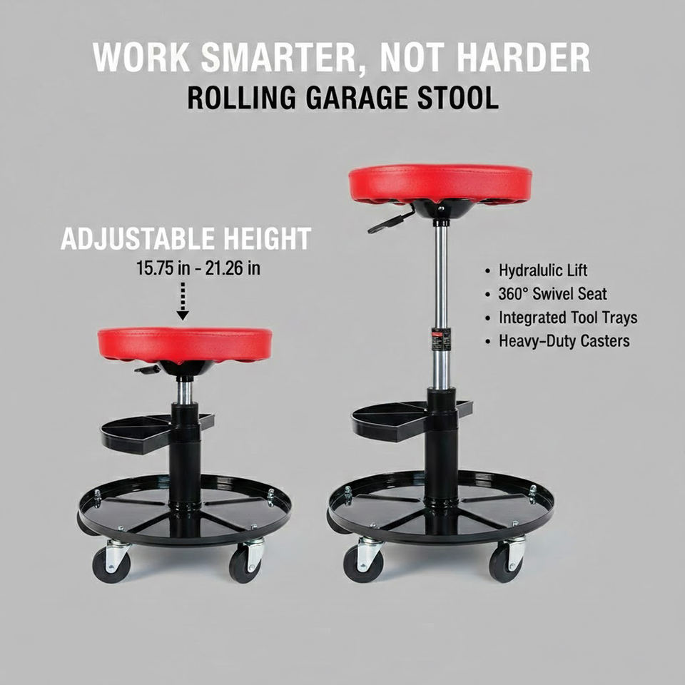 Siège d'atelier roulant réglable avec plateau à outils, siège de mécanicien pivotant à levage hydraulique avec roues GAPGAR029