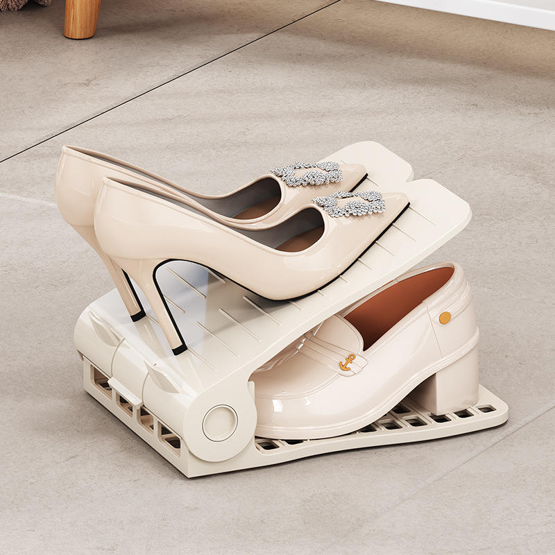 Étagère à chaussures réglable à double niveau, support de rangement en plastique blanc et gris, type rectangulaire sur pied pour usage domestique